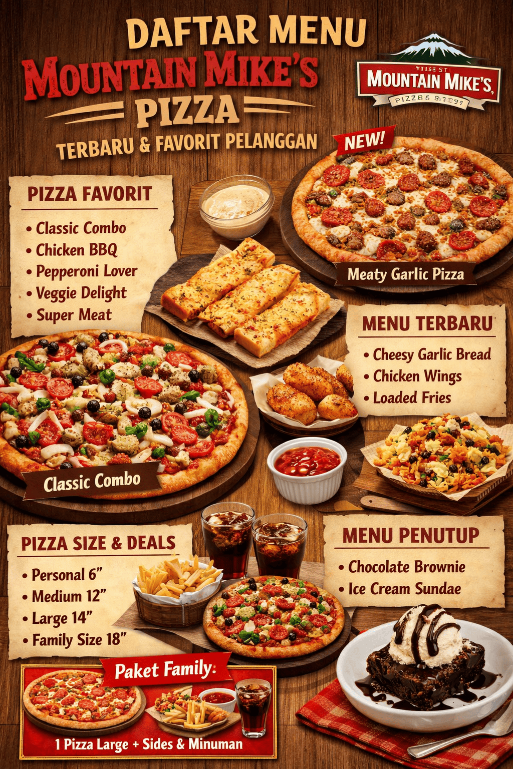 . Learn moreBETA108 menghadirkan Mountain Mike Pizza bagi pencinta pizza dengan topping melimpah dan cita rasa khas Amerika yang tidak pernah sepi peminat, Brand pizza asal Amerika Serikat ini dikenal dengan potongan besar, topping berlimpah, serta pilihan menu yang cocok untuk makan bersama keluarga maupun teman. Didirikan pada tahun 1978 di California, Mountain Mike Pizza telah berkembang menjadi jaringan restoran yang tersebar di berbagai wilayah Amerika. Ciri khas utamanya adalah pizza bergaya klasik dengan adonan tebal, saus tomat yang kaya rasa, dan topping yang sangat royal.
